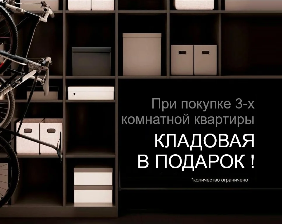 При покупке трёхкомнатной квартиры в доме №1 - кладовая в подарок. Предложение не является публичной офертой. Подробности акции уточняйте у менеджеров отдела продаж. Срок действия акции ограничен.